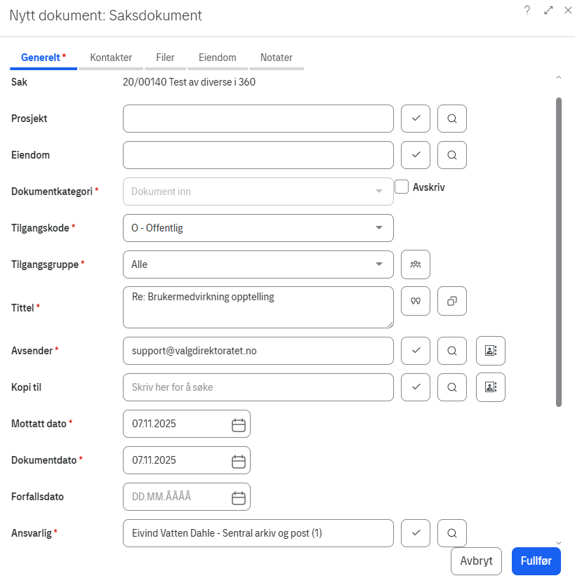 I neste bilde vil du se at e-posten som saksdokument i P360 automatisk arver informasjon fra saksmappen som den registreres inn i. Tilgangskode og tilgangsgruppe arves fra saken. Tittel og avsender blir automatisk den samme som i selve e-posten i Outlook.