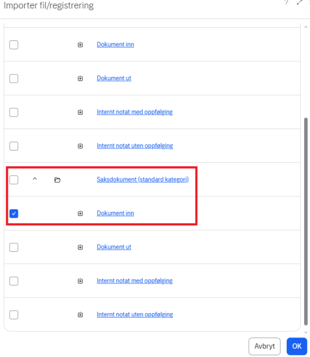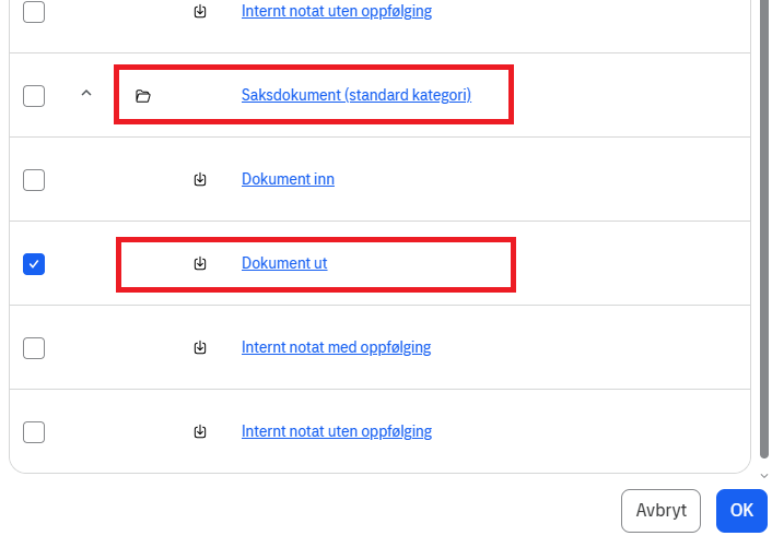 I neste bilde klikker du på Saksdokument (standard kategori) og huker av foran Dokument inn. Klikk deretter på OK: