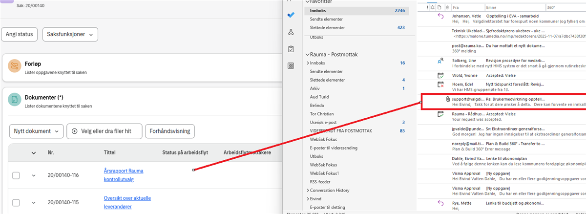 Hvis du har to skjermer, kan du ha P360 oppe på den ene skjermen og Outlook oppe på den andre. Bruker du en liten skjerm, har du Outlook åpen delvis over P360.